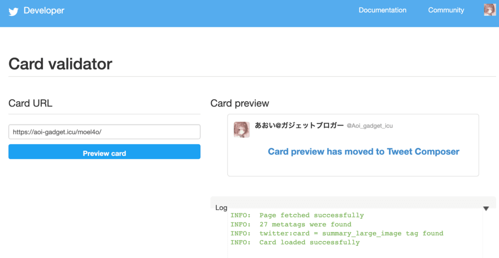 するととTwitterがそのURLを確認しに行き情報を更新してくれます。